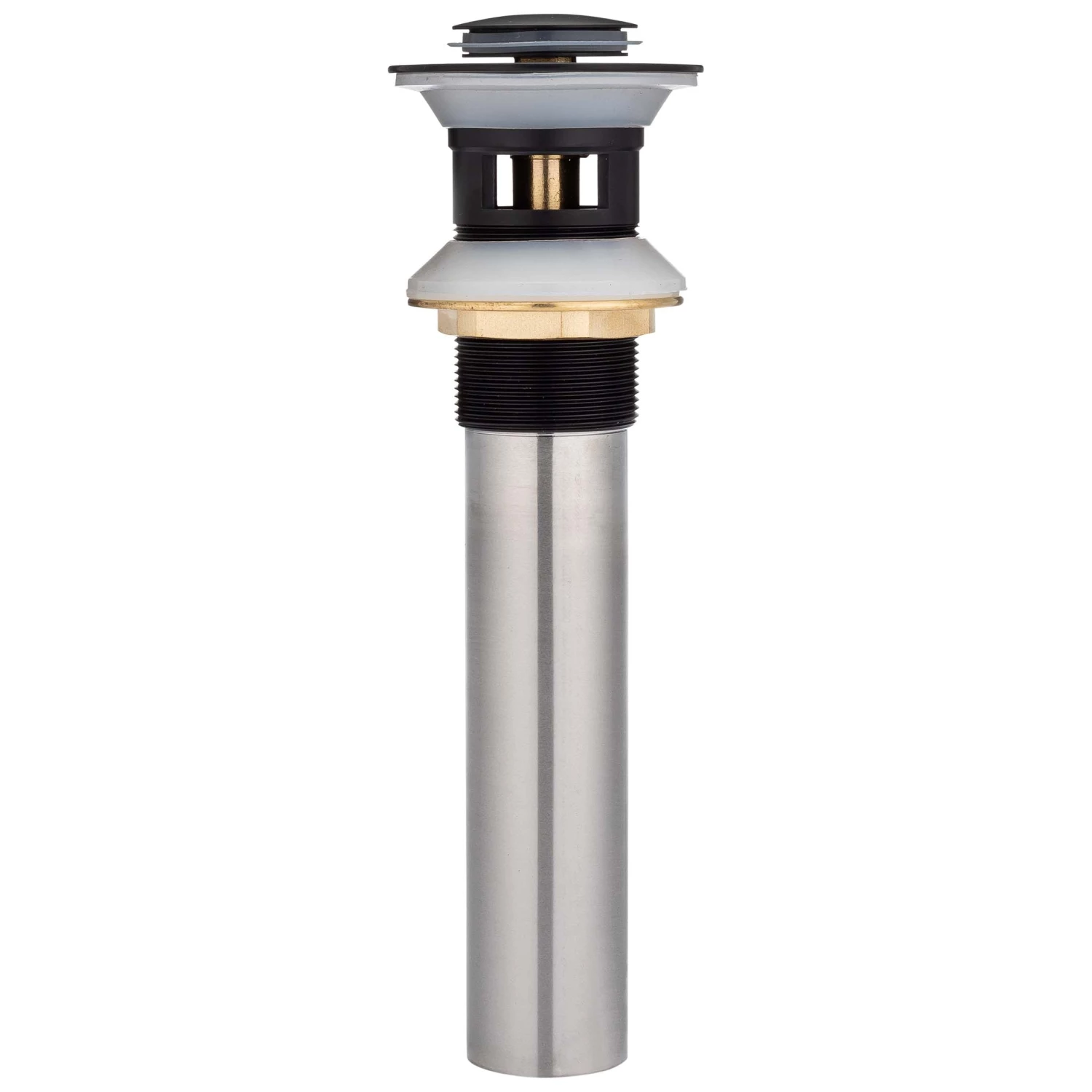 Bathroom Sink Push Pop Up Drain Stopper; Press Drain Cap To Close And Open; Designed For Sinks With Built In Overflows; Designed For Sinks With 1 1/2 Inch Diameter Drains; Fabricated With Zinc Stopper And Flange With Brass Tailpiece; Matte Black Finish.