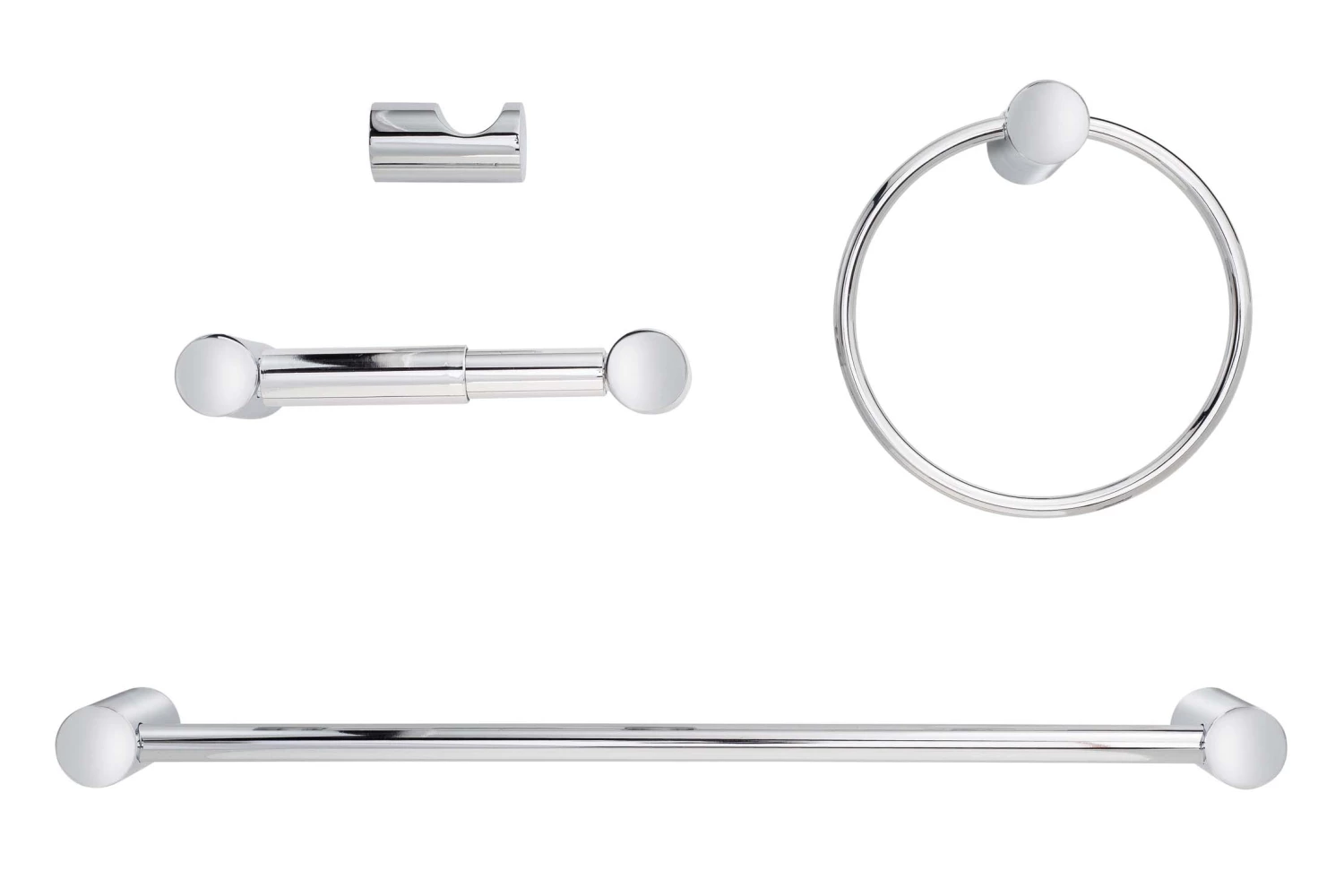 Set Consists Of Four Items That Are Purchased Individually; Set Contains: Robe Hook / Towel Hook, Toilet Paper Holder, 24 Inch Towel Bar, Towel Ring; Fabricated With Die Cast Zinc With Brass Or Stainless Steel Bars And Rings; Chrome Finish.