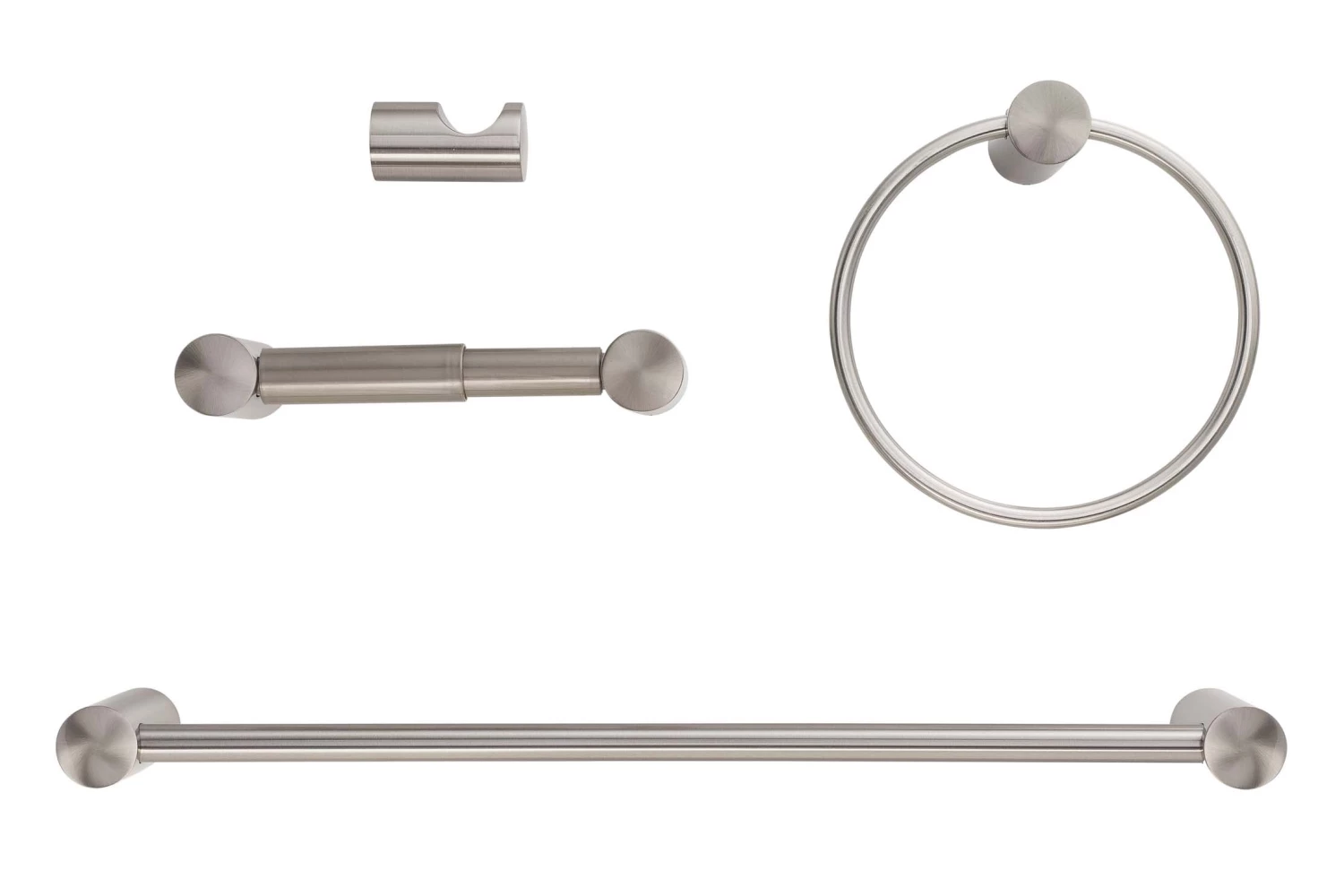 Set Consists Of Four Items That Are Purchased Individually; Set Contains: Robe Hook / Towel Hook, Toilet Paper Holder, 24 Inch Towel Bar, Towel Ring; Fabricated With Die Cast Zinc With Brass Or Stainless Steel Bars And Rings; Satin Nickel Finish.
