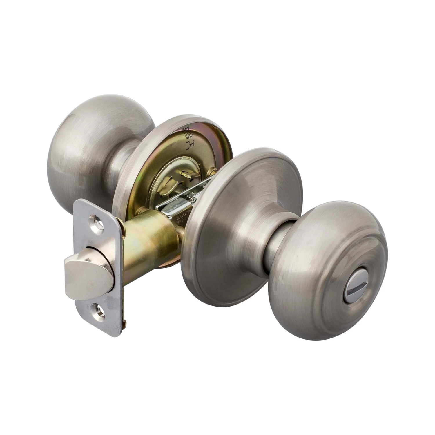 Traditional Style Privacy Function Door Knob Set; Thumbturn Latches And Opens Inside; Ships With Mortise Latch (Not Drive In); Latch Face 1 Inch X 2 1/4 Inches X 1/4 Inch Radius Corners; Optional Drive In Latch Available, 1 Inch Diameter, (Product Number # 87394); Optional UL Fire Rated Latch Available, (Product Number # 87373); Fits Doors 1 3/8 Inches To 1 3/4 Inches Thick; Fits Doors With Backsets 2 3/8 Inches Or 2 3/4 Inches; Fits Doors With A 2 1/8 Inch Cross Bore; 5-Year Mechanical And Finish Warranty; ANSI Grade 3; Fabricated With Brass Knob And Steel Mechanism; Satin Nickel Finish.
