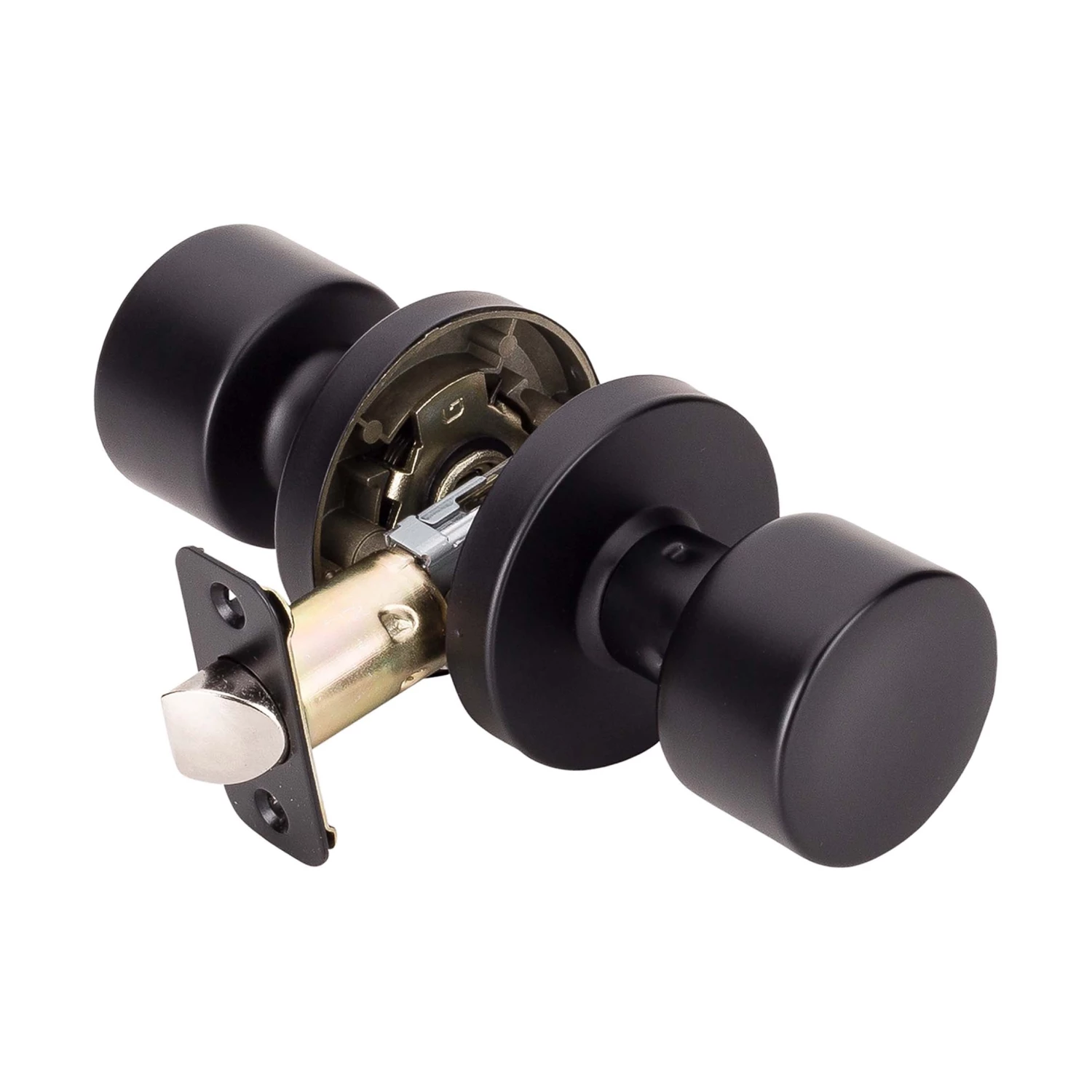 Contemporary Style Passage Function Door Knob Set; No Locking Mechanism, Both Inside And Outside Always Open Door; Ships With Mortise Latch (Not Drive In); Latch Face 1 Inch X 2 1/4 Inches X 1/4 Inch Radius Corners; Optional Drive In Latch Available, 1 Inch Diameter, (Product Number # 87398); Fits Doors 1 3/8 Inches To 1 3/4 Inches Thick; Fits Doors With Backsets 2 3/8 Inches Or 2 3/4 Inches; Fits Doors With A 2 1/8 Inch Cross Bore; 5-Year Mechanical And Finish Warranty; ANSI Grade 3; Fabricated With Brass Knob And Steel Mechanism; Matte Black Finish.
