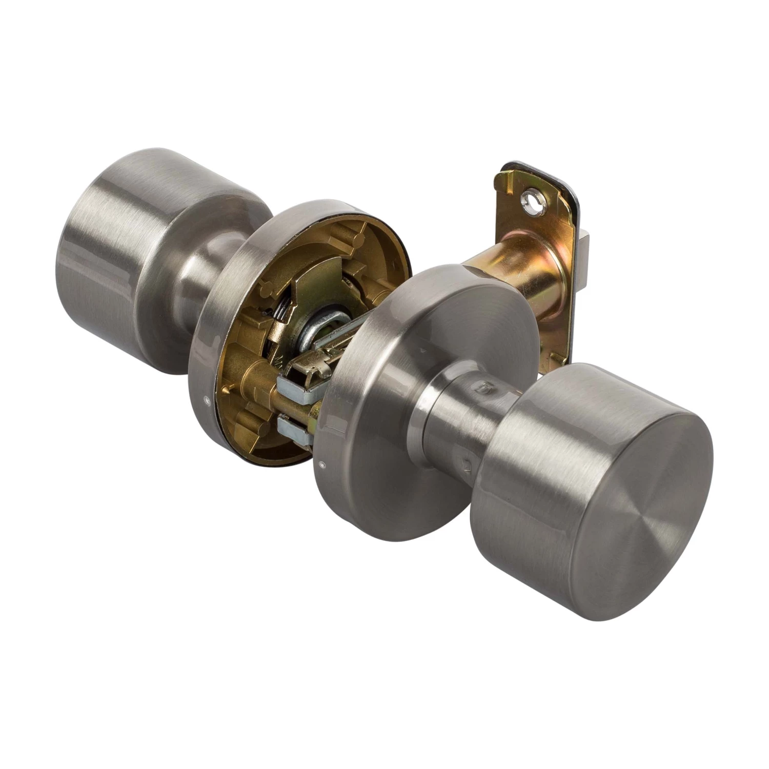 Contemporary Style Passage Function Door Knob Set; No Locking Mechanism, Both Inside And Outside Always Open Door; Ships With Mortise Latch (Not Drive In); Latch Face 1 Inch X 2 1/4 Inches X 1/4 Inch Radius Corners; Optional Drive In Latch Available, 1 Inch Diameter, (Product Number # 87398); Fits Doors 1 3/8 Inches To 1 3/4 Inches Thick; Fits Doors With Backsets 2 3/8 Inches Or 2 3/4 Inches; Fits Doors With A 2 1/8 Inch Cross Bore; 5-Year Mechanical And Finish Warranty; ANSI Grade 3; Fabricated With Brass Knob And Steel Mechanism; Satin Nickel Finish.