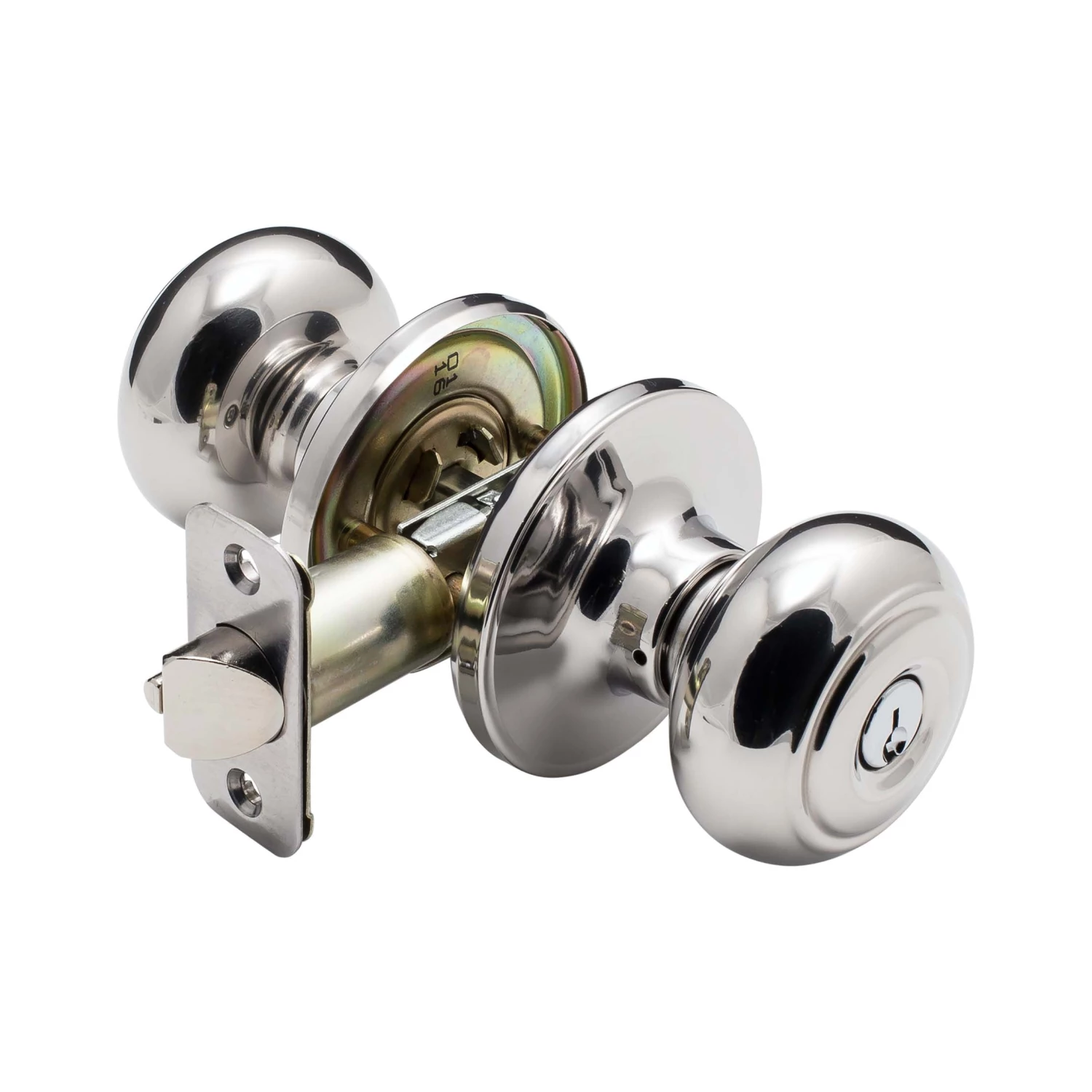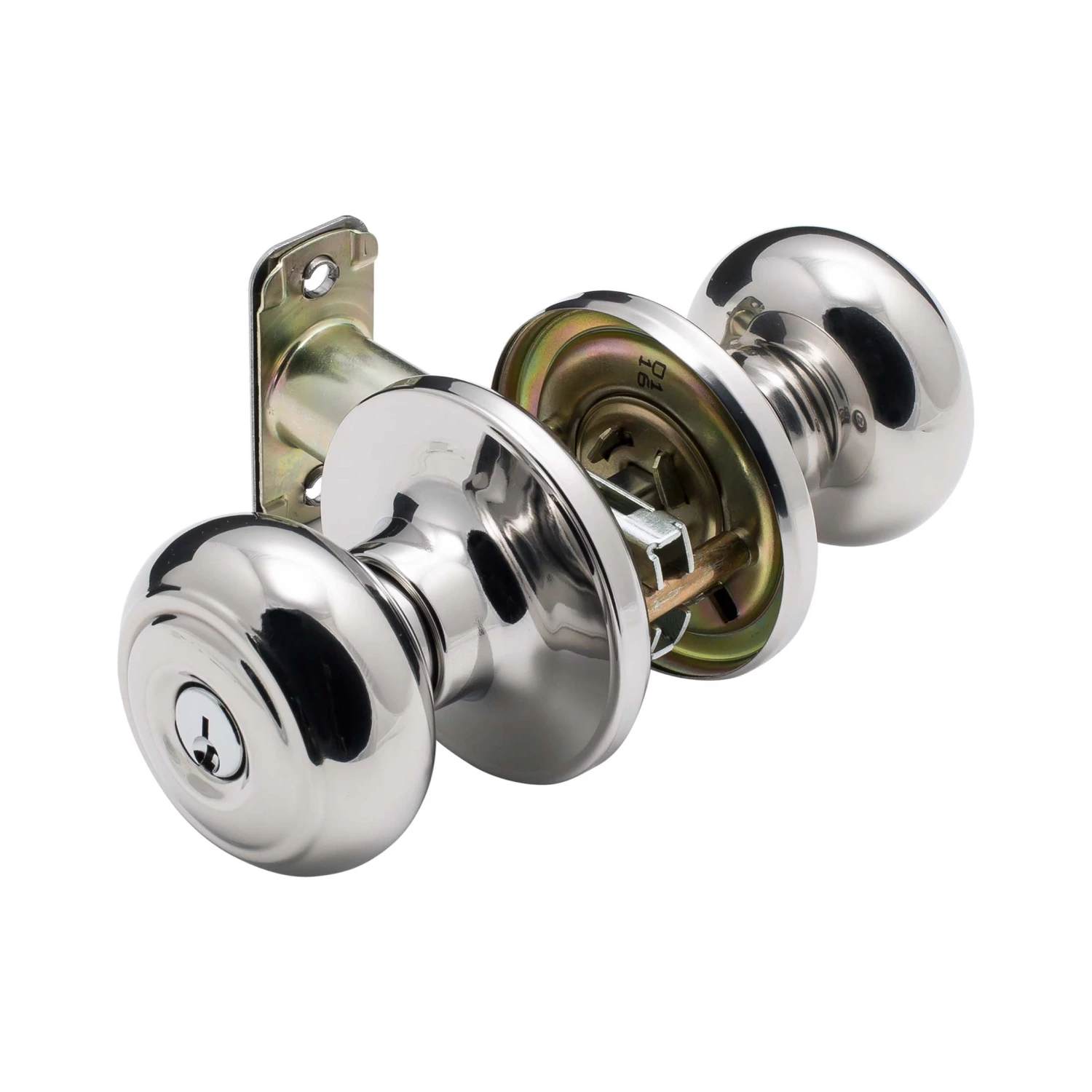 Traditional Style Entry Function Door Knob Set; Key Opens Outside With Inside Thumb Turn; Keying Alike And Master Keying Available; 5-Pin Tumbler Kwikset KW-1 Keyway; Ships With Mortise Latch (Not Drive In); Latch Face 1 Inch X 2 1/4 Inches X 1/4 Inch Radius Corners; Optional Drive In Latch Available, 1 Inch Diameter, (Product Number # 87392); Optional UL Fire Rated Latch Available, (Product Number # 87370); Fits Doors 1 3/8 Inches To 1 3/4 Inches Thick; Fits Doors With Backsets 2 3/8 Inches Or 2 3/4 Inches; Fits Doors With A 2 1/8 Inch Cross Bore; 5-Year Mechanical And Finish Warranty; ANSI Grade 3; Fabricated With Brass Knob And Steel Mechanism; Chrome Finish.