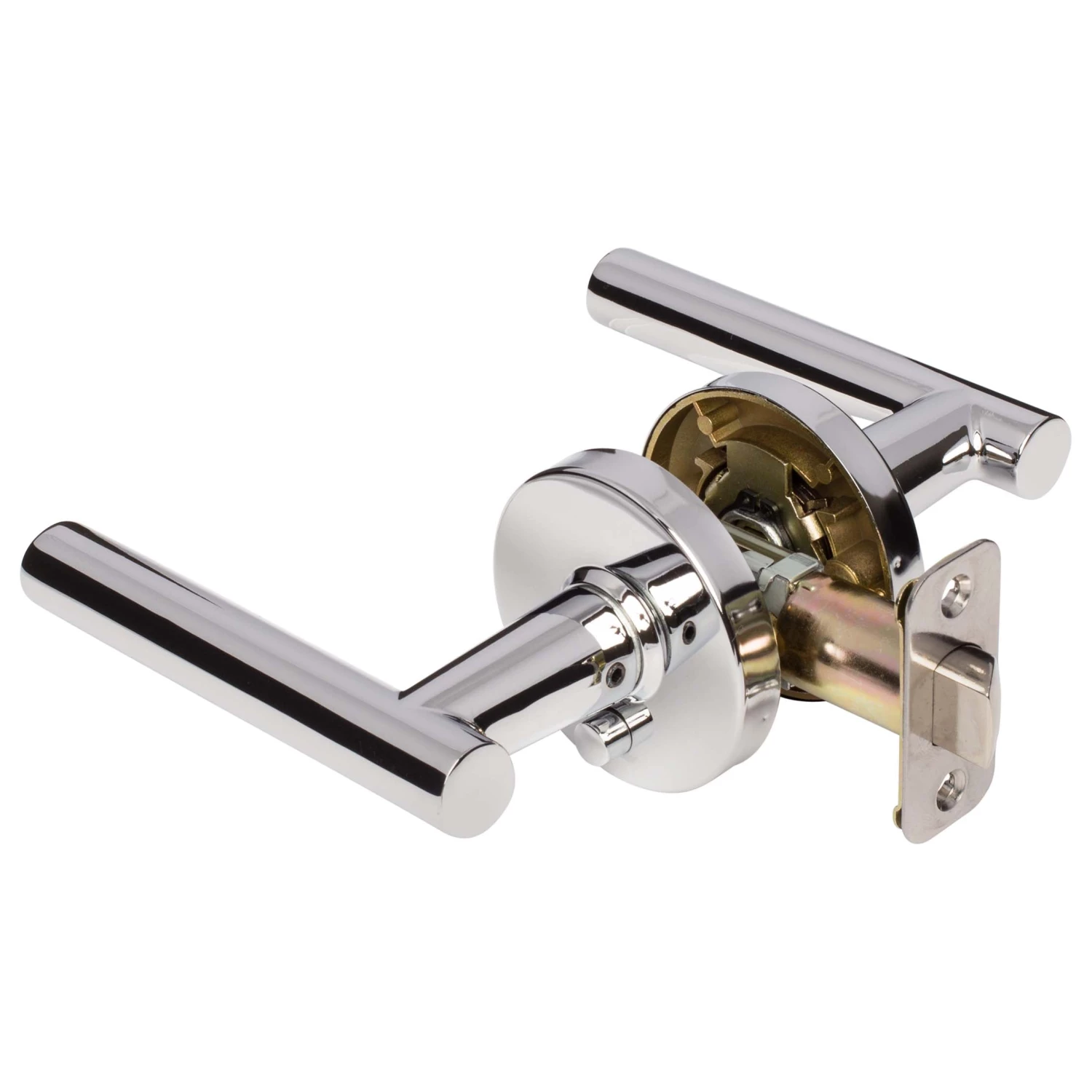 Contemporary Style Privacy Function Door Lever Set; Pushbutton Latches Inside, Lever Push Opens Latch; Ships With Mortise Latch (Not Drive In); Latch Face 1 Inch X 2 1/4 Inches X 1/4 Inch Radius Corners; Optional Drive In Latch Available, 1 Inch Diameter, (Product Number # 87398); Fits Doors 1 3/8 Inches To 1 3/4 Inches Thick; Fits Doors With Backsets 2 3/8 Inches Or 2 3/4 Inches; Fits Doors With A 2 1/8 Inch Cross Bore; 5-Year Mechanical And Finish Warranty; ANSI Grade 3; ADA Compliant; Fabricated With Die Cast Zinc Levers And Steel Mechanism; Chrome Finish.