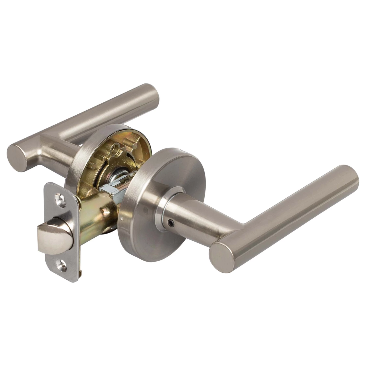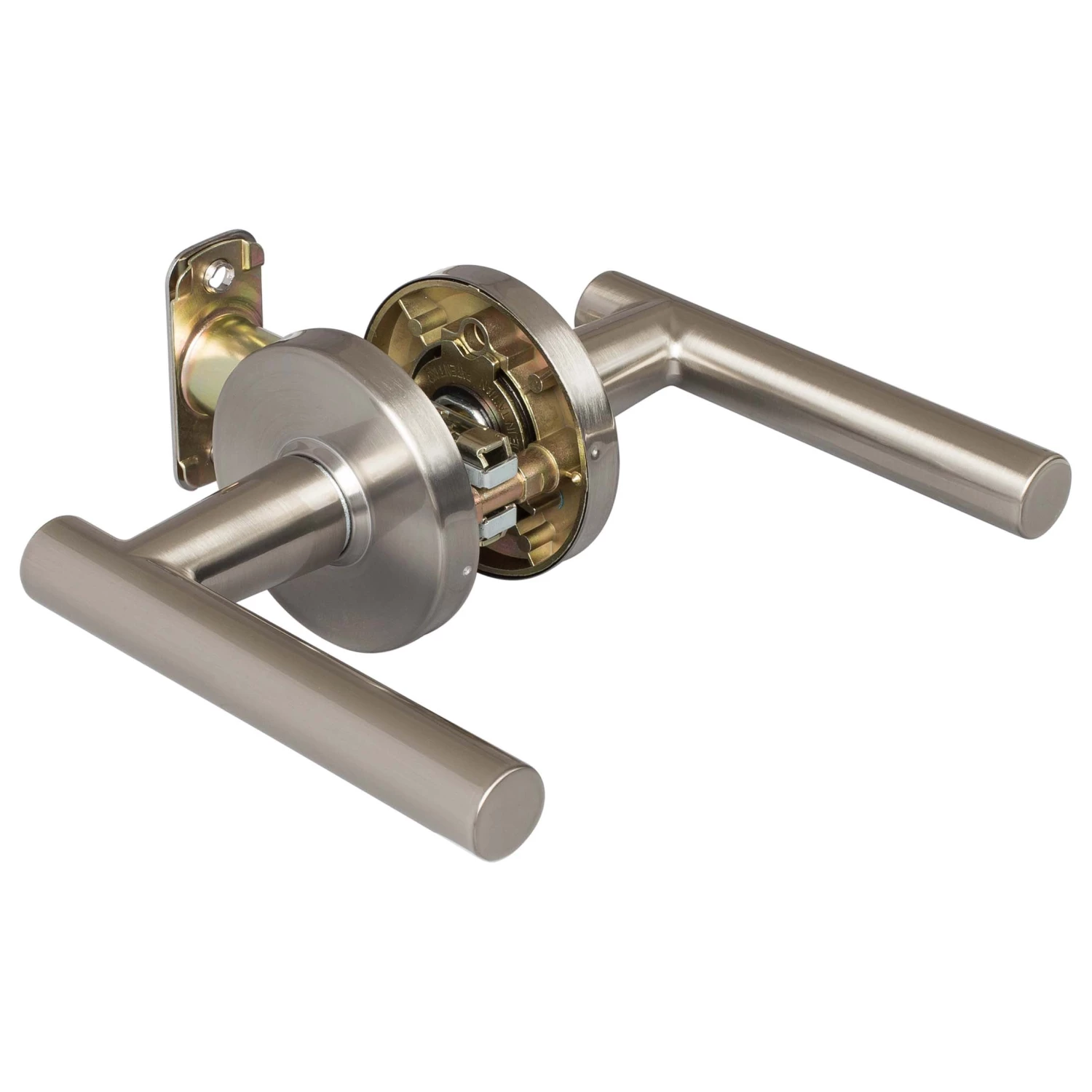 Contemporary Style Passage Function Door Lever Set; No Locking Mechanism, Both Inside And Outside Always Open Door; Ships With Mortise Latch (Not Drive In); Latch Face 1 Inch X 2 1/4 Inches X 1/4 Inch Radius Corners; Optional Drive In Latch Available, 1 Inch Diameter, (Product Number # 87398); Fits Doors 1 3/8 Inches To 1 3/4 Inches Thick; Fits Doors With Backsets 2 3/8 Inches Or 2 3/4 Inches; Fits Doors With A 2 1/8 Inch Cross Bore; 5-Year Mechanical And Finish Warranty; ANSI Grade 3; ADA Compliant; Fabricated With Die Cast Zinc Levers And Steel Mechanism; Satin Nickel Finish.