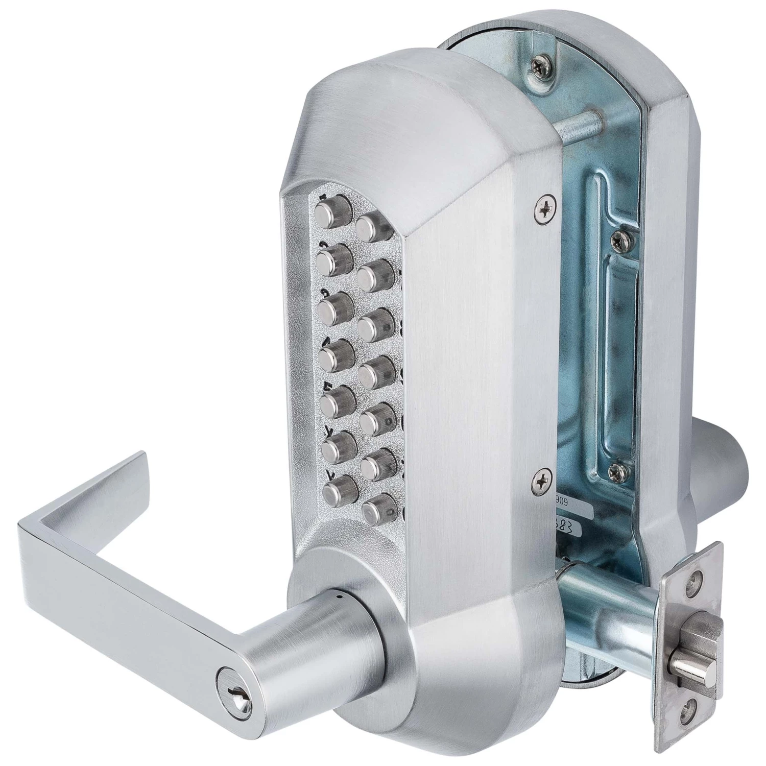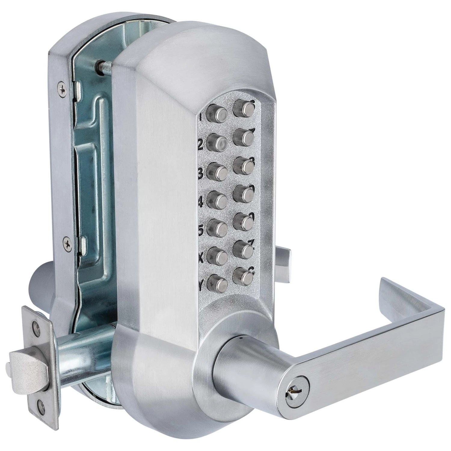 Mechanical Keyless Double Sided Door Lever Set; No Batteries Or Electrical Wiring Required; Push Buttons And Levers On Both Sides; Weather Resistant; ADA Compliant; Non Handed, Works With Both Left And Right Handed Doors; Break Away Levers Minimize Chances Of Forced Entry; Designed For Commercial Doors With 161 Preparations Or Residential Doors With Standard Preparations; Fits Doors 1 3/8 Inches To 2 1/4 Inches Thick; Fits Doors With 2 3/4 Inch Backsets 2 3/8 Inch Backset Latches Available (Product # MPBCL60MM); Keying Alike And Master Keying Available; Passcode Or Key Open Both Sides; 1- 12 Digit Code Lengths; Easy On Door Code Changes; Schlage SC4 6-Pin Keyway; Fabricated With Die Cast Zinc And Steel Mechanism; Satin Chrome Finish.