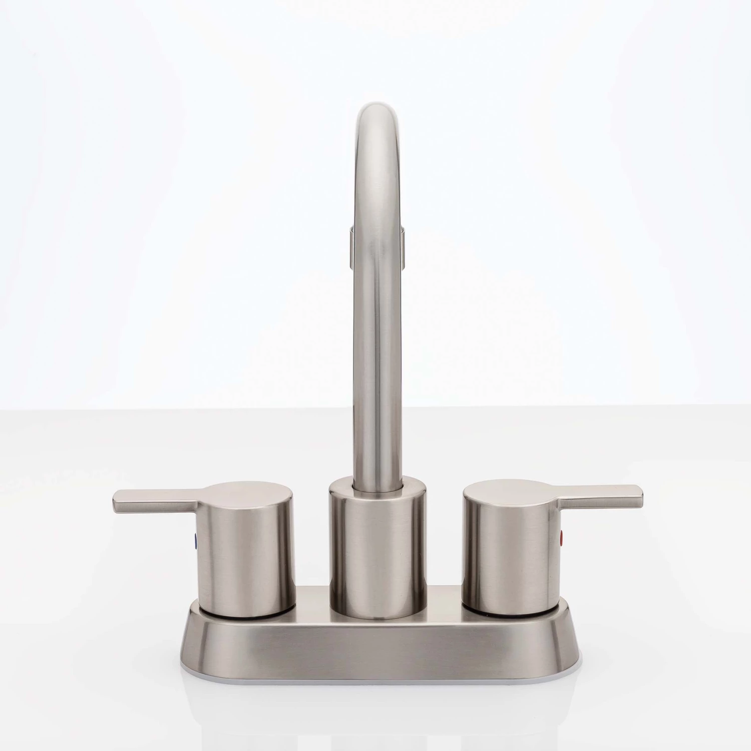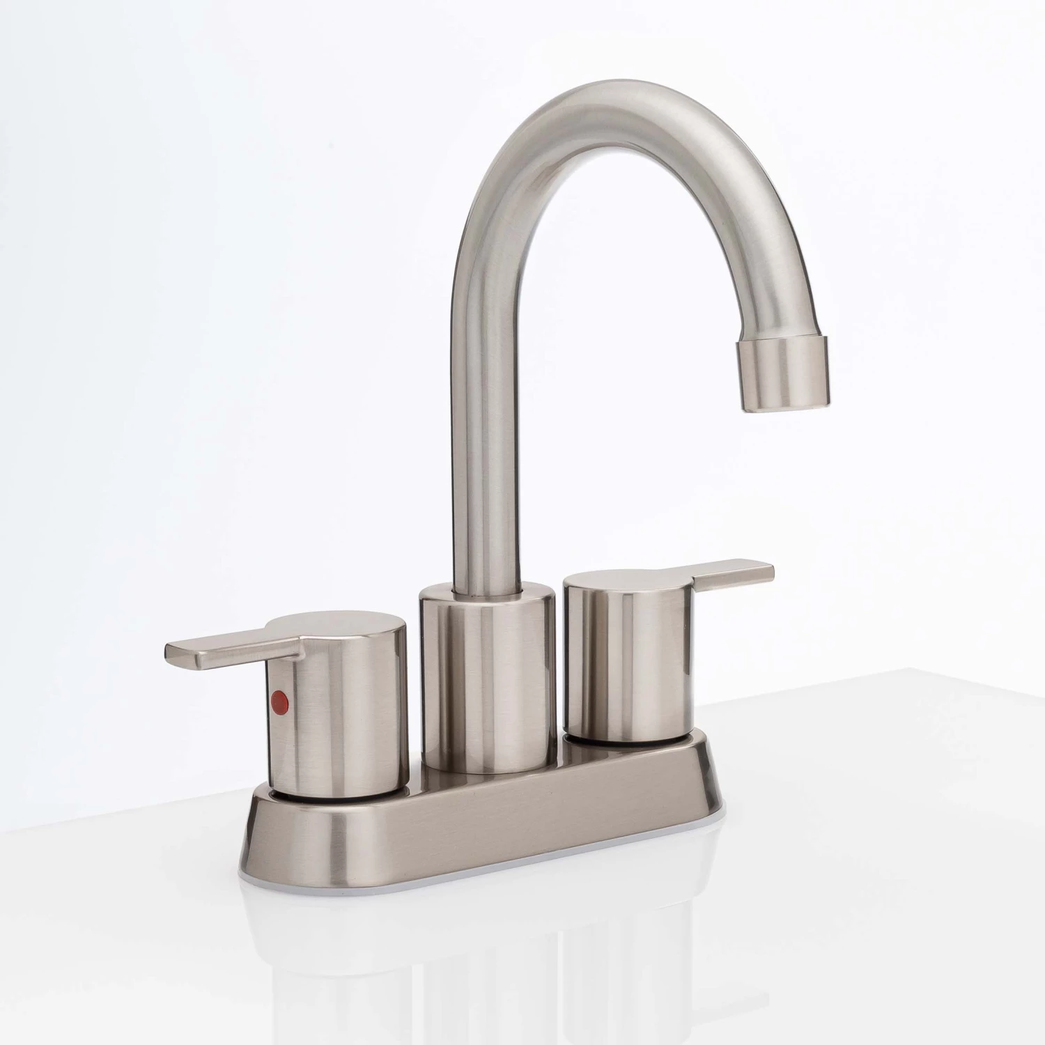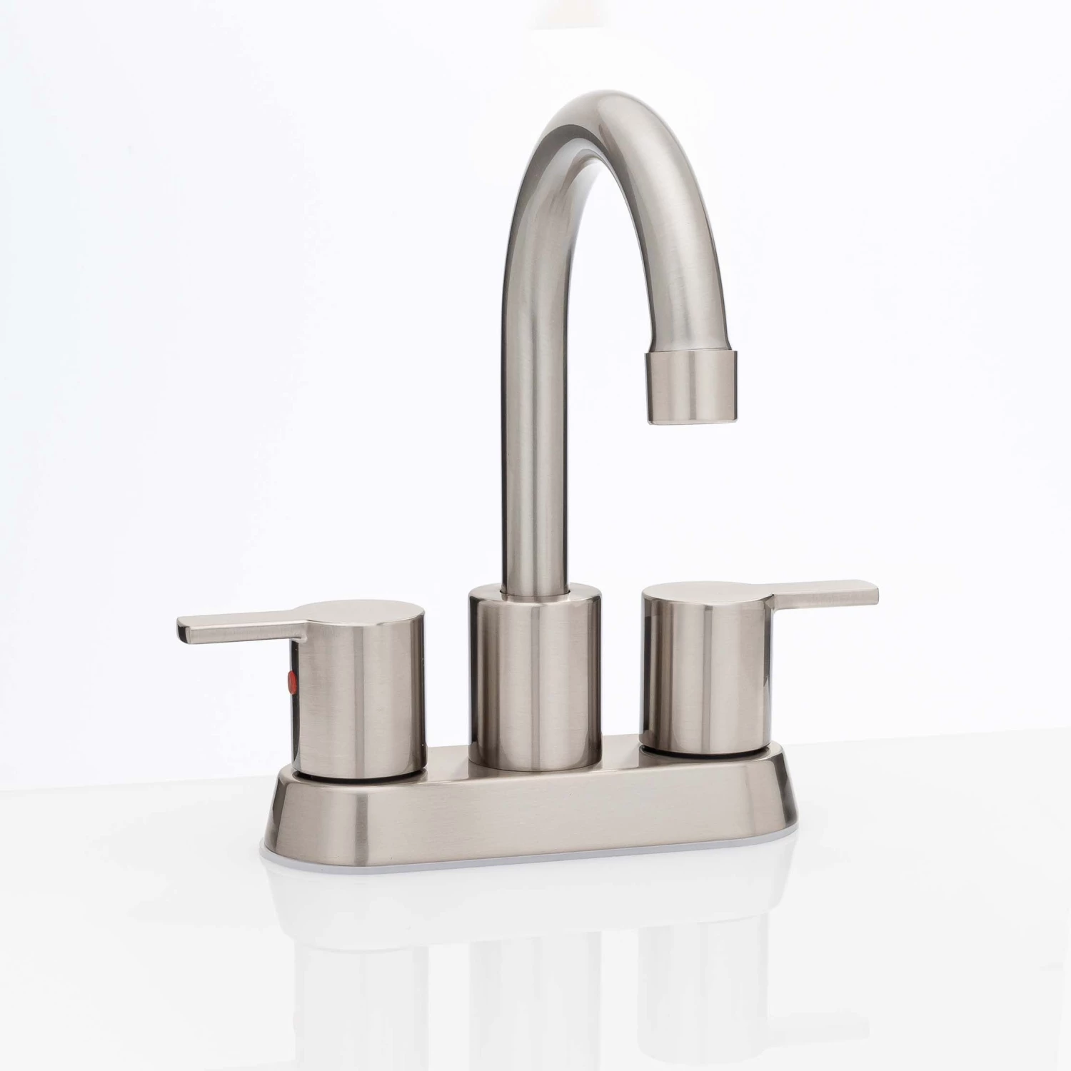 Centerset Contemporary / Modern Bathroom Sink Faucet, 4″ wide. Complies with UPC. NSF 61 certified to meet AB1953 standard. WaterSense certified, maximum 1.2 gallons per minute. ADA compliant. Pop up drain (product# PPOPV15) sold separately. Fabricated With Stainless Steel Body And Die Cast Zinc Handles; Satin Nickel Finish.