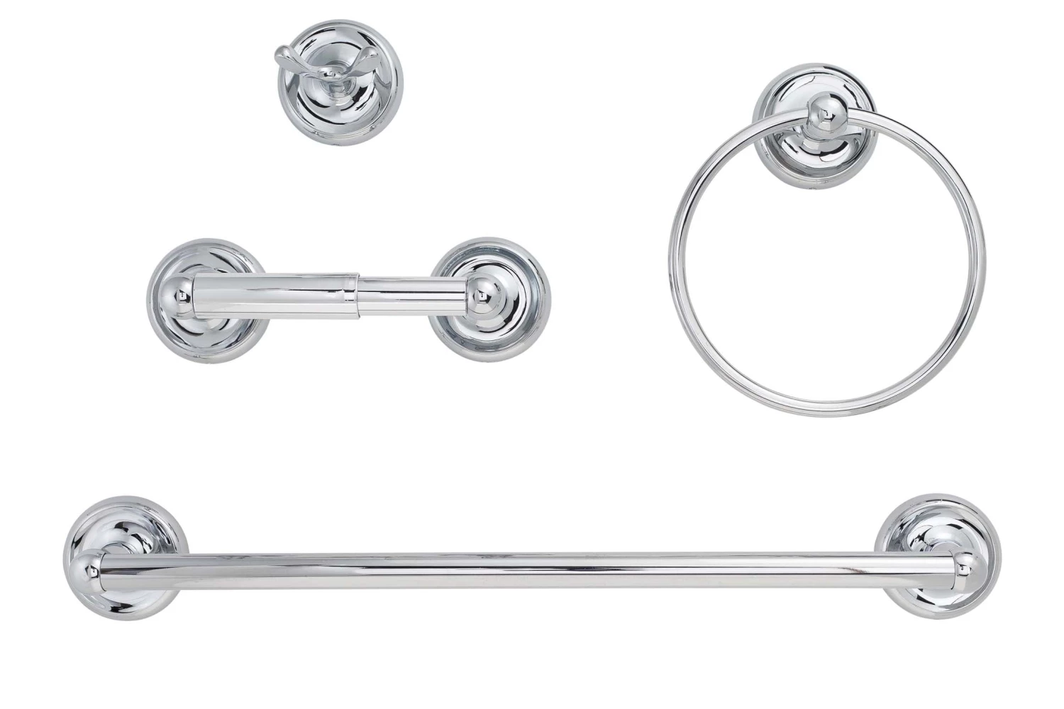 Set Consists Of Four Items That Are Purchased Individually; Set Contains: Robe Hook / Towel Hook, Toilet Paper Holder, 24 Inch Towel Bar, Towel Ring; Fabricated With Die Cast Zinc With Brass Or Stainless Steel Bars And Rings; Chrome Finish.