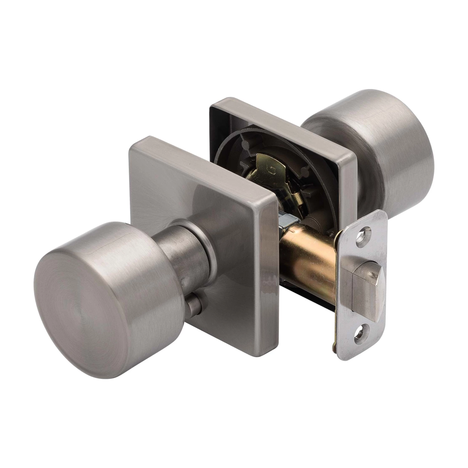Contemporary Style Privacy Function Door Knob Set; Pushbutton Latches Inside, Knob Turn Opens Latch; Ships With Mortise Latch (Not Drive In); Latch Face 1 Inch X 2 1/4 Inches X 1/4 Inch Radius Corners; Optional Drive In Latch Available, 1 Inch Diameter, (Product Number # 87398); Fits Doors 1 3/8 Inches To 1 3/4 Inches Thick; Fits Doors With Backsets 2 3/8 Inches Or 2 3/4 Inches; Fits Doors With A 2 1/8 Inch Cross Bore; 5-Year Mechanical And Finish Warranty; ANSI Grade 3; Fabricated With Brass Knob And Steel Mechanism; Satin Nickel Finish.
