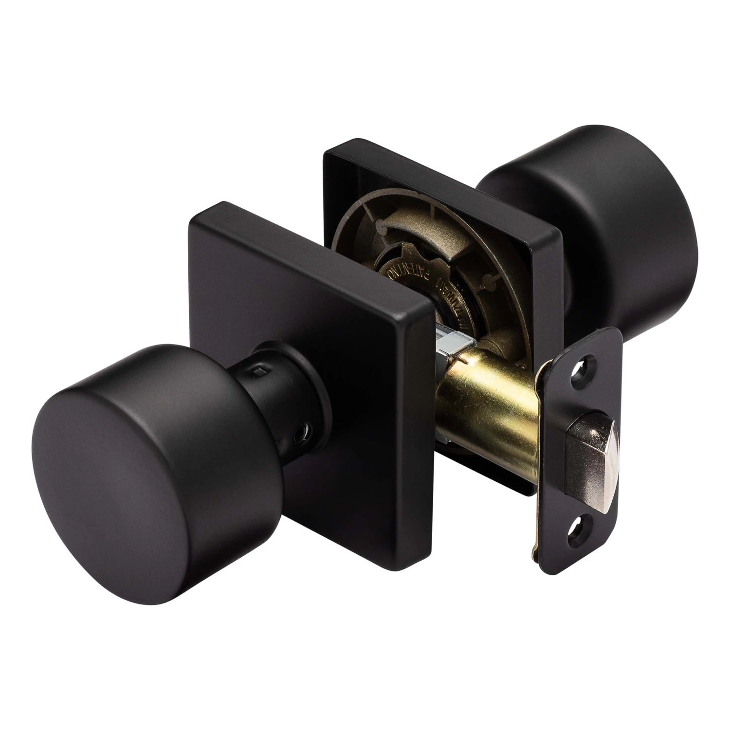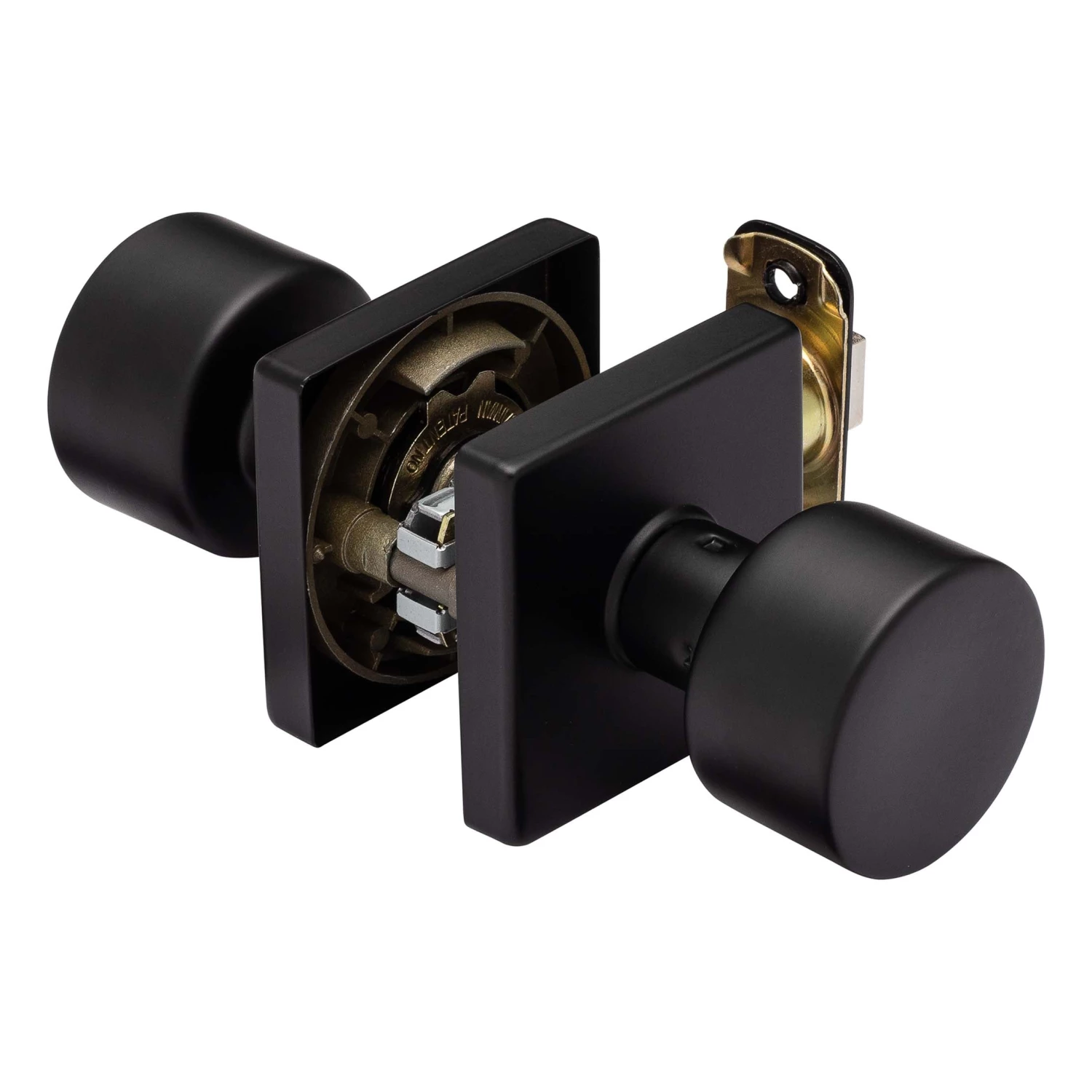 Contemporary Style Passage Function Door Knob Set; No Locking Mechanism, Both Inside And Outside Always Open Door; Ships With Mortise Latch (Not Drive In); Latch Face 1 Inch X 2 1/4 Inches X 1/4 Inch Radius Corners; Optional Drive In Latch Available, 1 Inch Diameter, (Product Number # 87398); Fits Doors 1 3/8 Inches To 1 3/4 Inches Thick; Fits Doors With Backsets 2 3/8 Inches Or 2 3/4 Inches; Fits Doors With A 2 1/8 Inch Cross Bore; 5-Year Mechanical And Finish Warranty; ANSI Grade 3; Fabricated With Brass Knob And Steel Mechanism; Matte Black Finish.