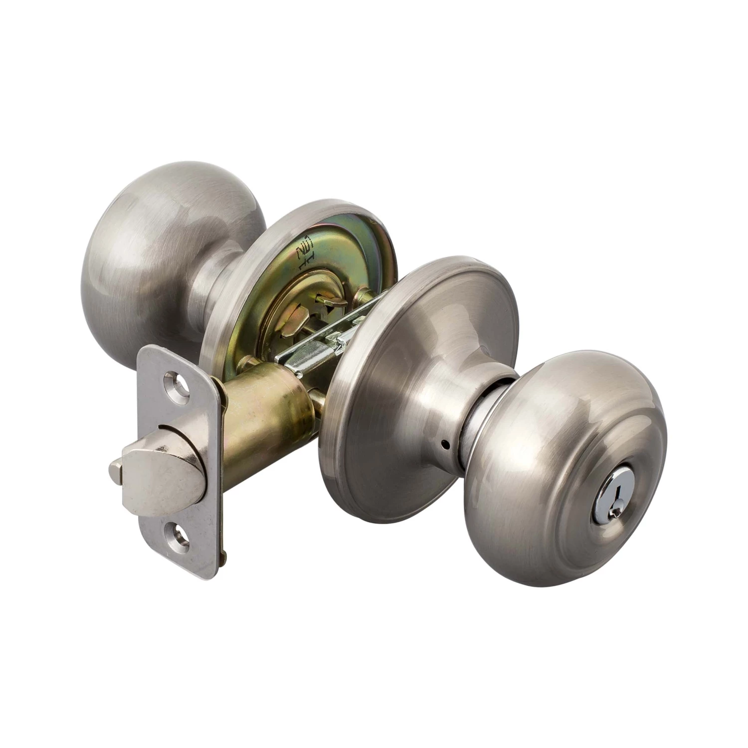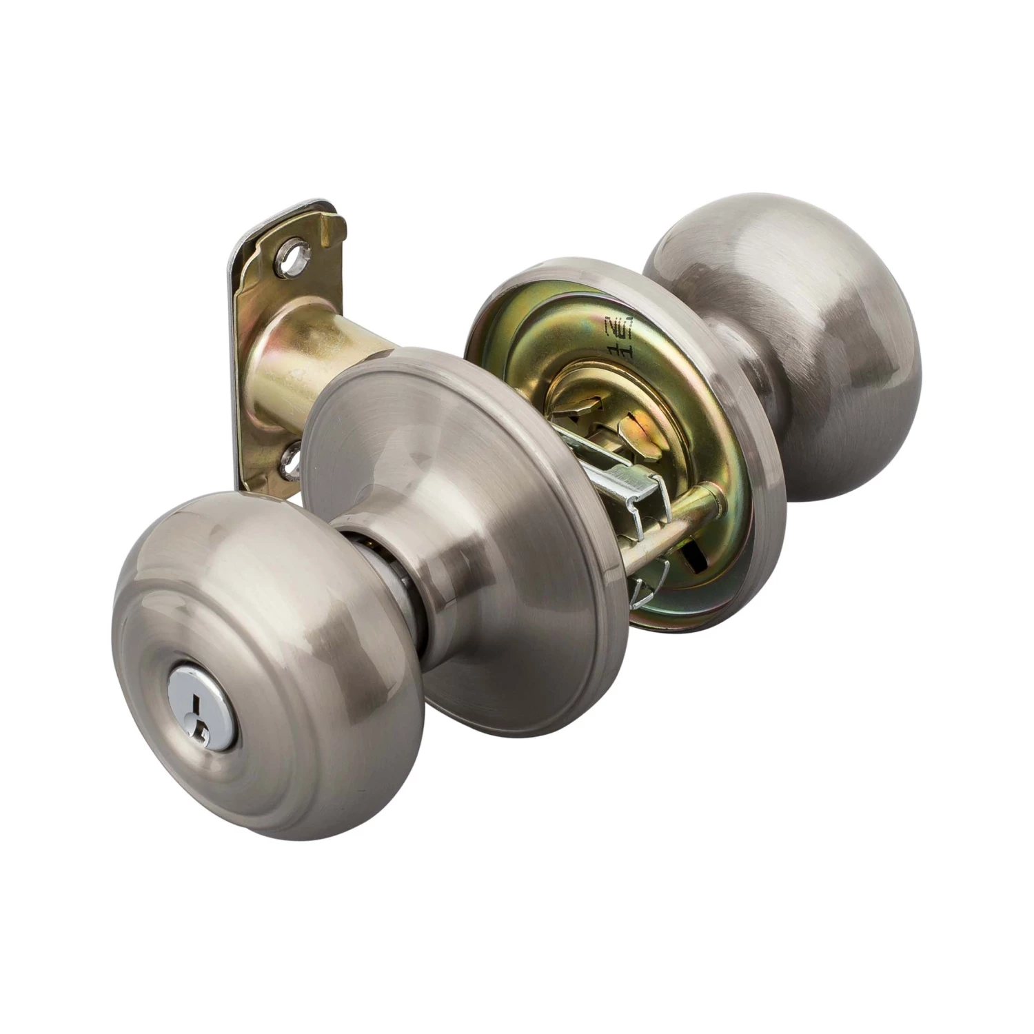 Traditional Style Entry Function Door Knob Set; Key Opens Outside With Inside Thumb Turn; Keying Alike And Master Keying Available; 5-Pin Tumbler Kwikset KW-1 Keyway; Ships With Mortise Latch (Not Drive In); Latch Face 1 Inch X 2 1/4 Inches X 1/4 Inch Radius Corners; Optional Drive In Latch Available, 1 Inch Diameter, (Product Number # 87392); Optional UL Fire Rated Latch Available, (Product Number # 87370); Fits Doors 1 3/8 Inches To 1 3/4 Inches Thick; Fits Doors With Backsets 2 3/8 Inches Or 2 3/4 Inches; Fits Doors With A 2 1/8 Inch Cross Bore; 5-Year Mechanical And Finish Warranty; ANSI Grade 3; Fabricated With Brass Knob And Steel Mechanism; Satin Nickel Finish.
