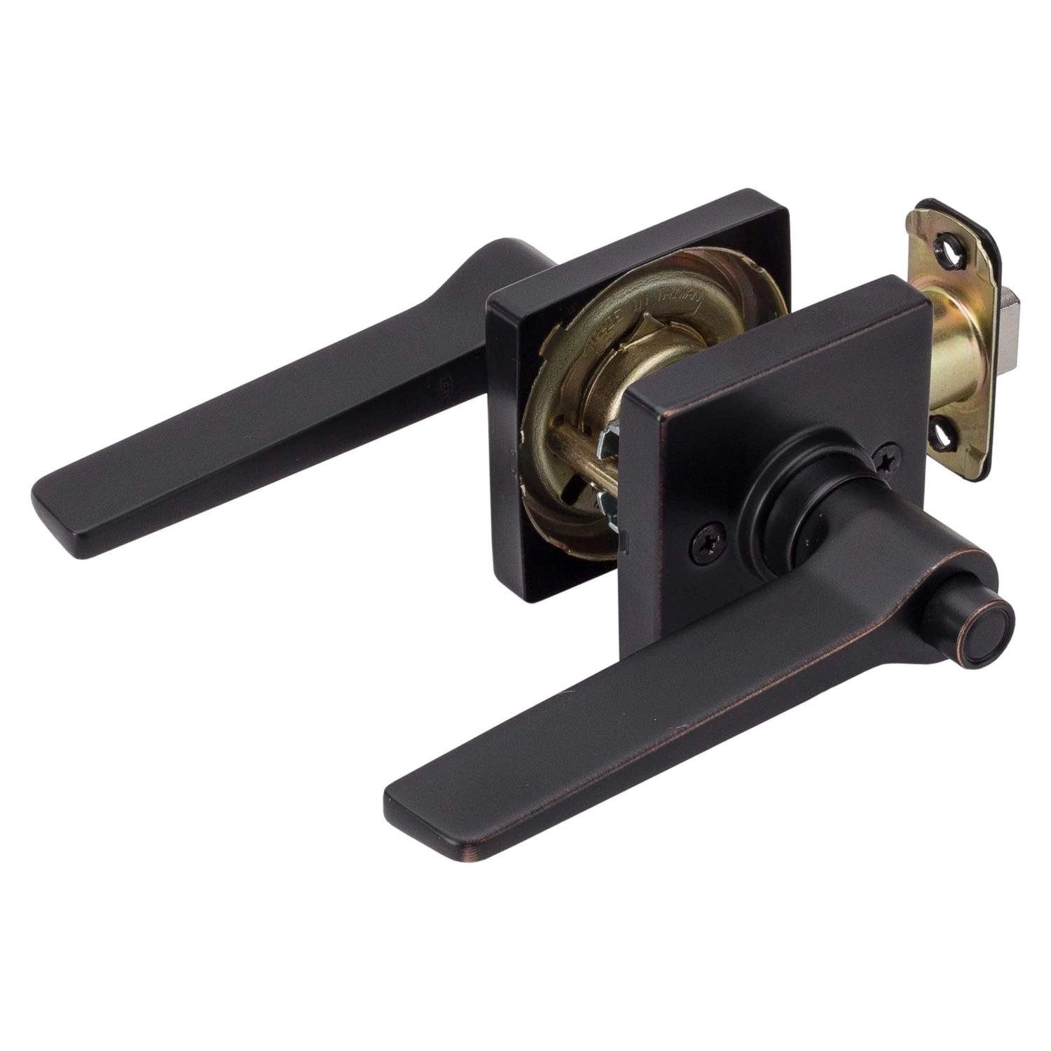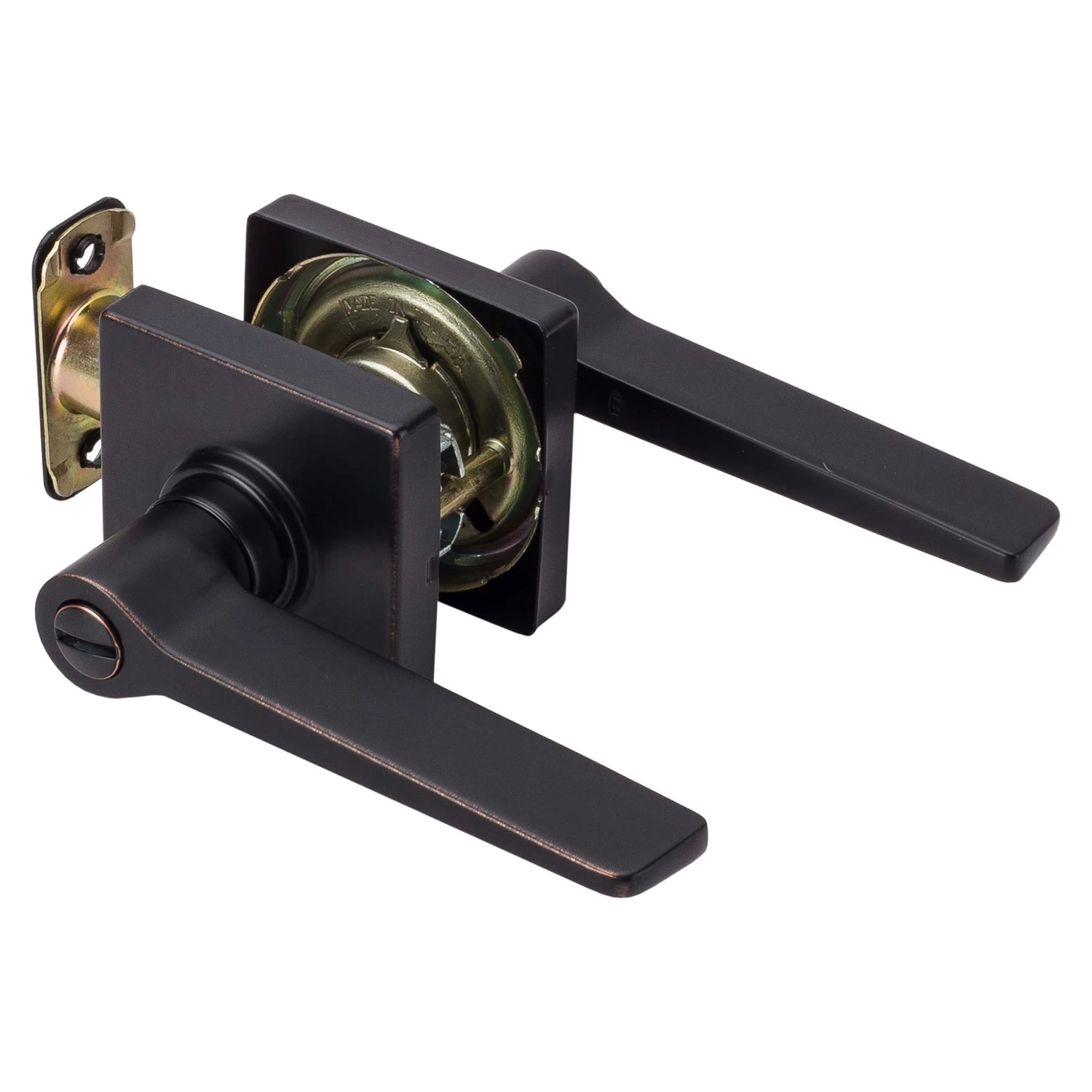 Contemporary Style Privacy Function Door Lever Set; Pushbutton Latches Inside, Lever Push Opens Latch; Ships With Mortise Latch (Not Drive In); Latch Face 1 Inch X 2 1/4 Inches X 1/4 Inch Radius Corners; Optional Drive In Latch Available, 1 Inch Diameter, (Product Number # 87394); Optional UL Fire Rated Latch Available, (Product Number # 87372); Fits Doors 1 3/8 Inches To 1 3/4 Inches Thick; Fits Doors With Backsets 2 3/8 Inches Or 2 3/4 Inches; Fits Doors With A 2 1/8 Inch Cross Bore; 5-Year Mechanical And Finish Warranty; ANSI Grade 3; ADA Compliant; Fabricated With Die Cast Zinc Levers And Steel Mechanism; Venetian Bronze Finish.