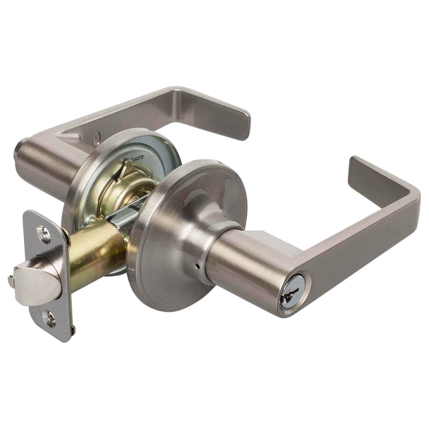 Traditional Style Entry Function Door Lever Set; Key Opens Outside With Inside Push Button; Keying Alike And Master Keying Available; 5-Pin Tumbler Kwikset KW-1 Keyway; Ships With Mortise Latch (Not Drive In); Latch Face 1 Inch X 2 1/4 Inches X 1/4 Inch Radius Corners; Optional Drive In Latch Available, 1 Inch Diameter, (Product Number # 87392); Optional UL Fire Rated Latch Available, (Product Number # 87370); Fits Doors 1 3/8 Inches To 1 3/4 Inches Thick; Fits Doors With Backsets 2 3/8 Inches Or 2 3/4 Inches; Fits Doors With A 2 1/8 Inch Cross Bore; 5-Year Mechanical And Finish Warranty; ANSI Grade 3; ADA Compliant; Fabricated With Die Cast Zinc Levers And Steel Mechanism; Satin Nickel Finish.