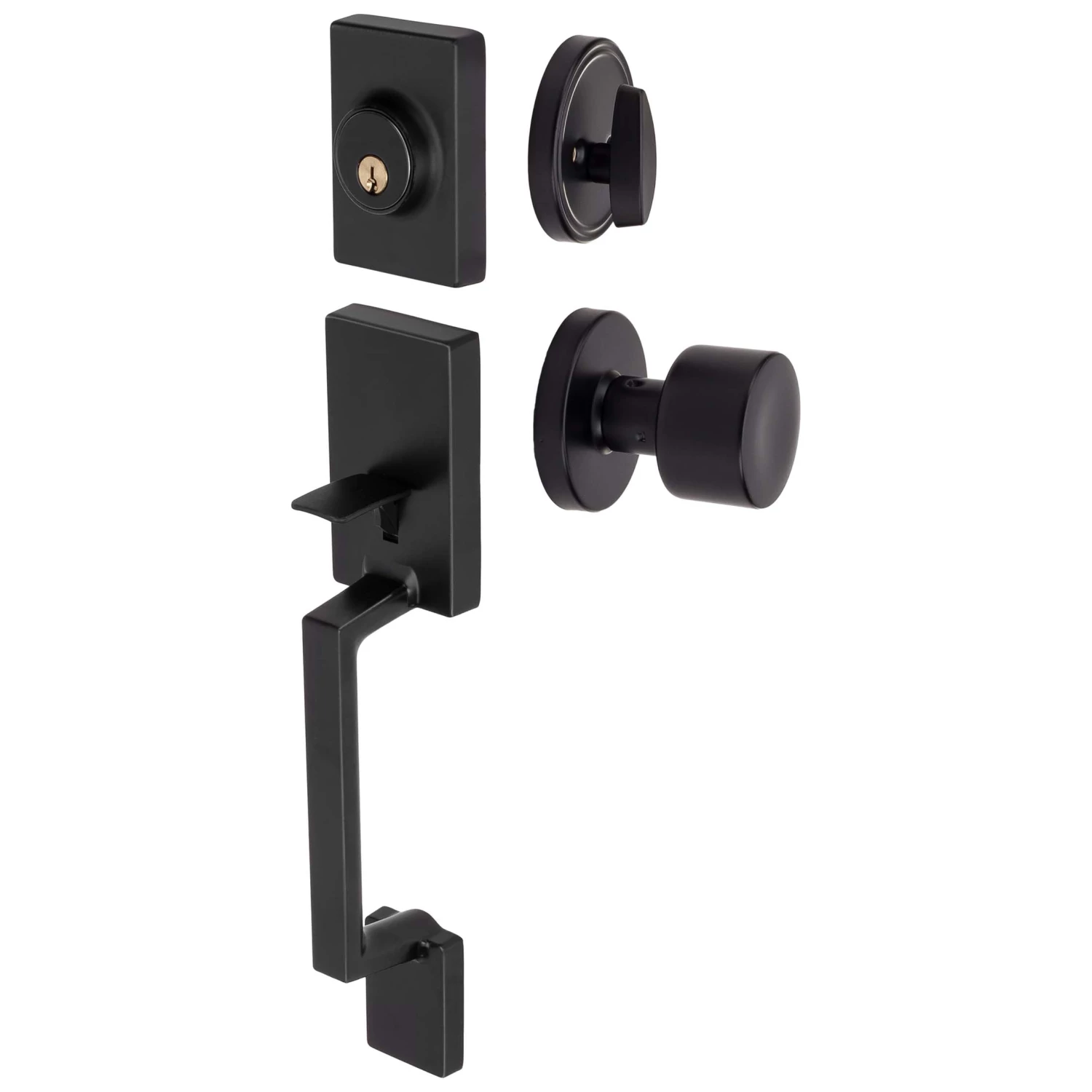 Contemporary Style Handleset; Key Opens Outside With Inside Thumb Turn; Keying Alike And Master Keying Available; 5-Pin Tumbler Kwikset KW-1 Keyway; Ships With Mortise Latch (Not Drive In); Latch Face 1 Inch X 2 1/4 Inches X 1/4 Inch Radius Corners; Optional Drive In Latches Available, 1 Inch Diameter, (Product Number # 87396 And # 87398); Fits Doors 1 3/8 Inches To 1 3/4 Inches Thick; Fits Doors With Backsets 2 3/8 Inches Or 2 3/4 Inches; Fits Doors With A 2 1/8 Inch Cross Bore; 5-Year Mechanical And Finish Warranty; ANSI Grade 3; Fabricated With Die Cast Zinc Handle, Brass Knob, and Steel Mechanism; Matte Black Finish.