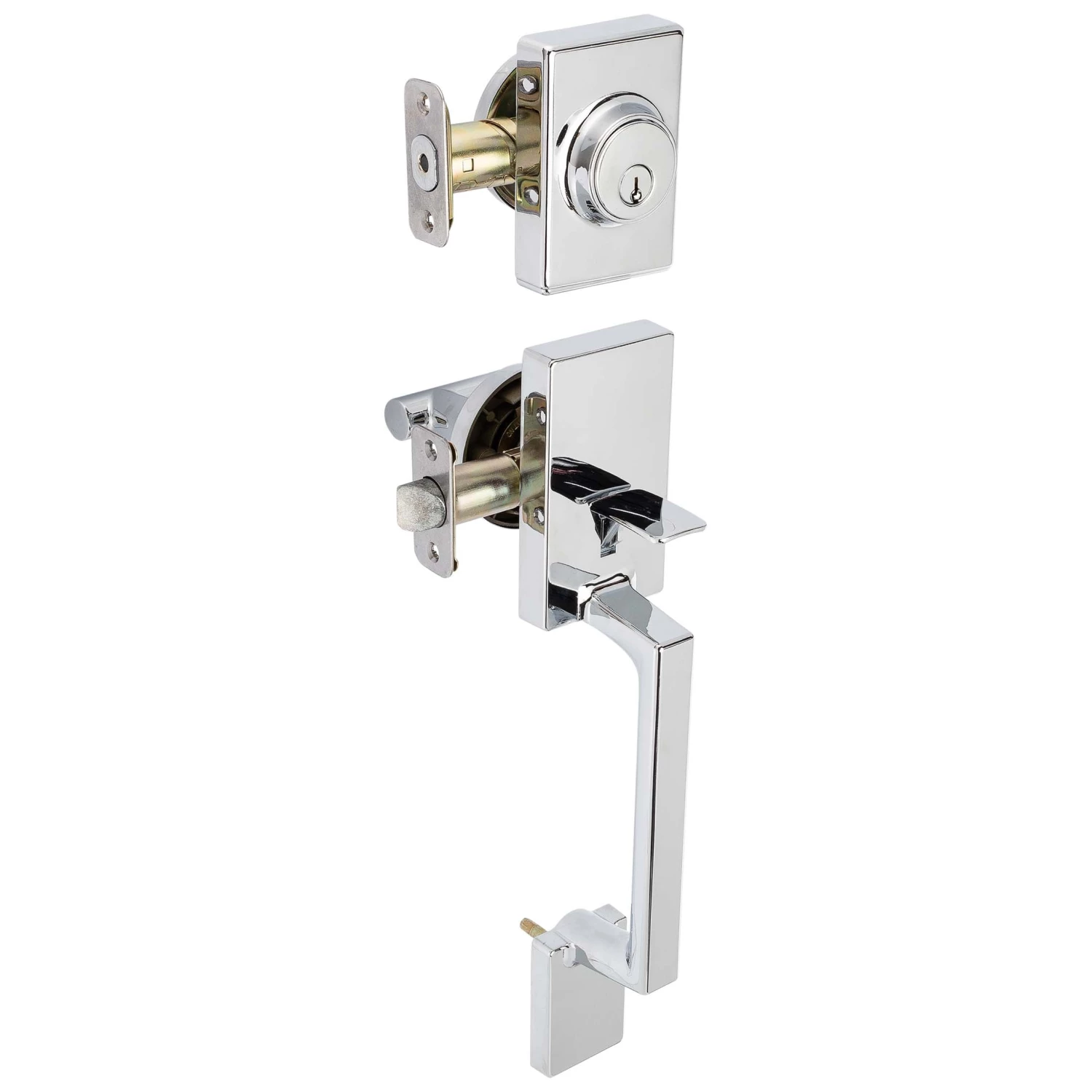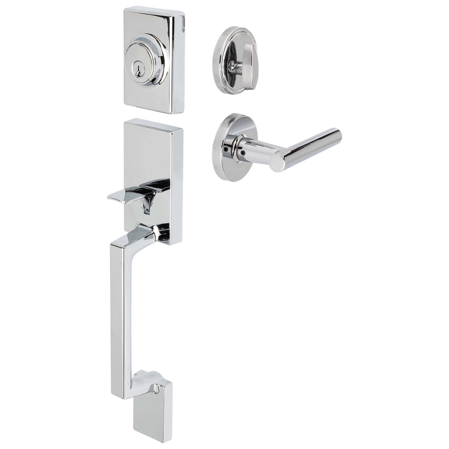 Contemporary Style Handleset; Key Opens Outside With Inside Thumb Turn; Keying Alike And Master Keying Available; 5-Pin Tumbler Kwikset KW-1 Keyway; Ships With Mortise Latch (Not Drive In); Latch Face 1 Inch X 2 1/4 Inches X 1/4 Inch Radius Corners; Optional Drive In Latches Available, 1 Inch Diameter, (Product Number # 87396 And # 87398); Fits Doors 1 3/8 Inches To 1 3/4 Inches Thick; Fits Doors With Backsets 2 3/8 Inches Or 2 3/4 Inches; Fits Doors With A 2 1/8 Inch Cross Bore; 5-Year Mechanical And Finish Warranty; ANSI Grade 3; Fabricated With Die Cast Zinc Handle And Lever And Steel Mechanism; Chrome Finish.