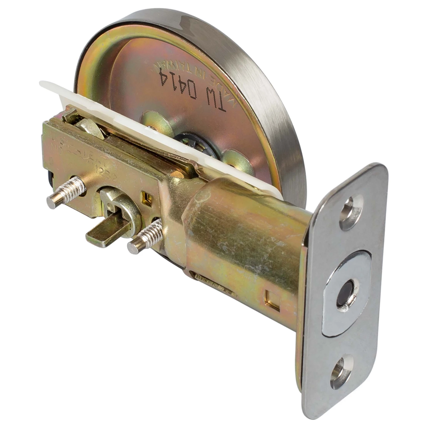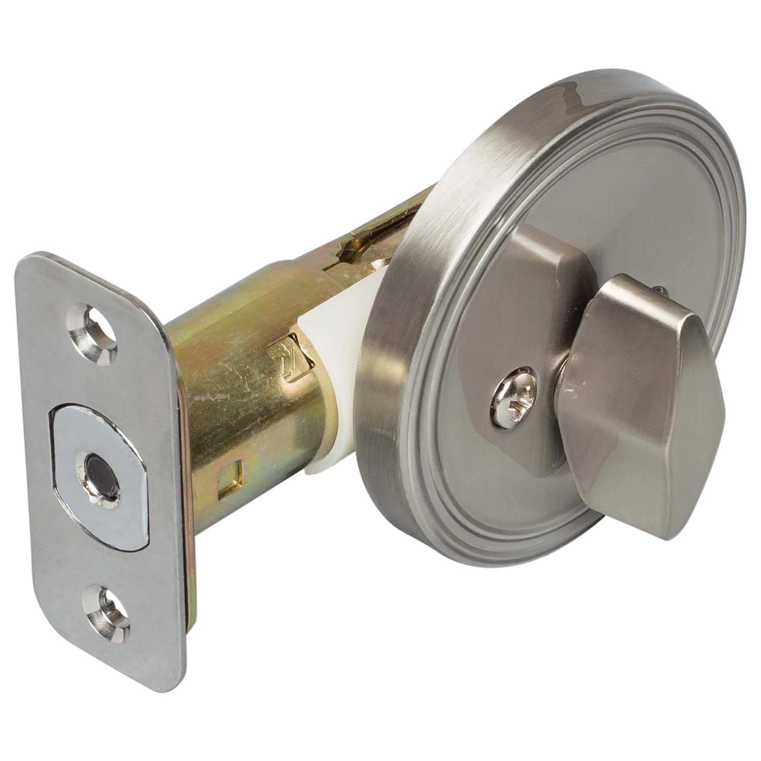 Traditional Style Keyless Single Sided Deadbolt; Thumbturn Opens Inside; Ships With Mortise Latch (Not Drive In); Latch Face 1 Inch X 2 1/4 Inches X 1/4 Inch Radius Corners; Optional Drive In Latch Available, 1 Inch Diameter, (Product Number # 87396); Optional UL Fire Rated Latch Available, (Product Number # 87374); Fits Doors 1 3/8 Inches To 1 3/4 Inches Thick; Fits Doors With Backsets 2 3/8 Inches Or 2 3/4 Inches; Fits Doors With A 2 1/8 Inch Cross Bore; 5-Year Mechanical And Finish Warranty; ANSI Grade 3; Fabricated With Brass Cover And Steel Mechanism; Satin Nickel Finish.